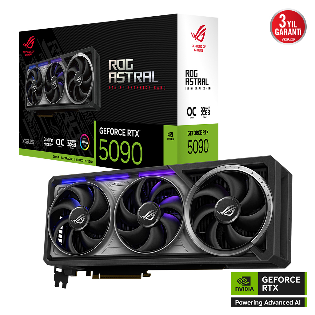 Yeni ROG Astral ailesi kozmosun sonsuz büyüklüğünden ve güzelliğinden ilham aldı. Astral ailesi, yeni ufuklar keşfetmeye ve tanımlamaya yönelik bitmek bilmeyen bir adanmışlığın kanıtıdır. Bu vizyonu takip eden ROG Astral GeForce RTX 5090, ROG’nin ilk dört fanlı ekran kartı olma konumuna sahip. Bu dört fana ek olarak patentli buhar bölmesi, artırılmış soğutma bloğu kanatları ve faz değişimli GPU termal dolgusu ile varsayılan saat hızları, artırılmış güç ve daha fazlasını sizlere sunar. Bu gibi birinci sınıf yenilikler, göz alıcı döküm iskelet ve metal GPU braketi ile birleşerek en zorlu oyun senaryolarının bile üstesinden gelebilecek üst düzey performans ortaya koyar.