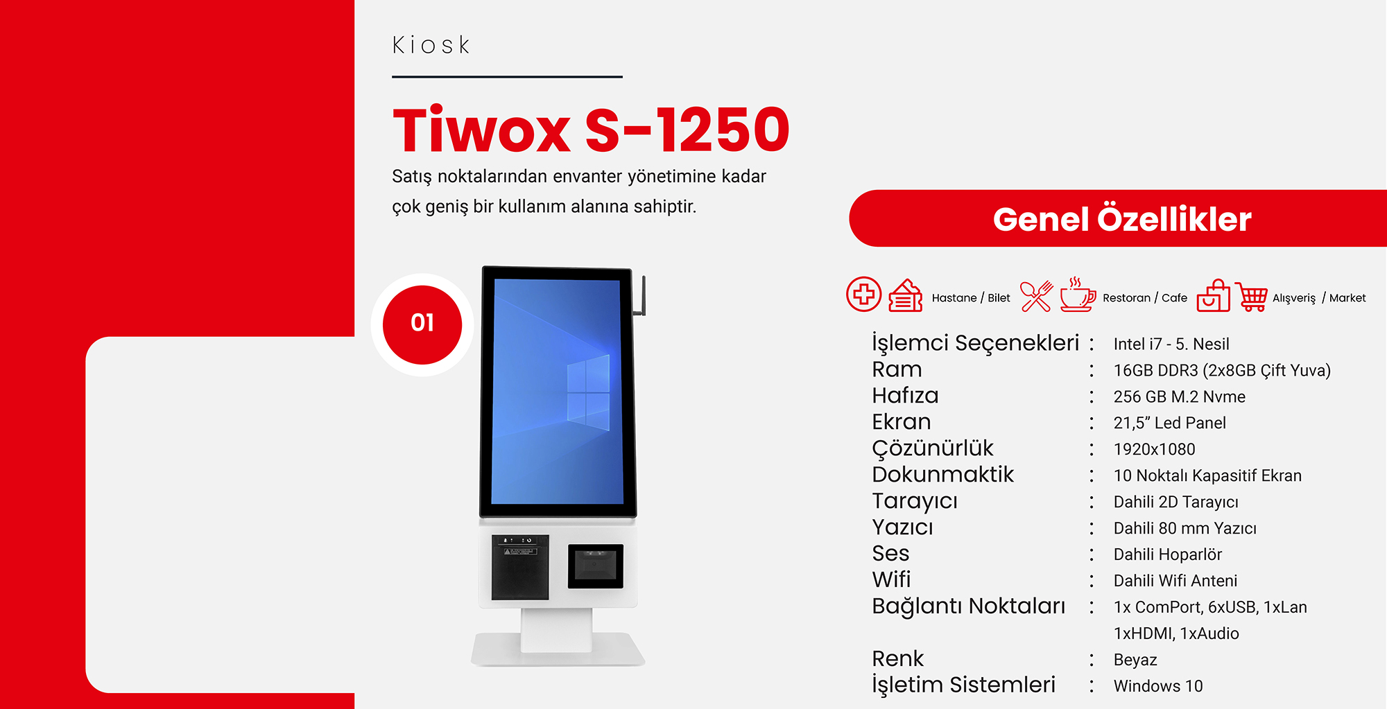 Tiwox S-1250, 21,5" Led Panel, Intel i7 5.Gen, 16Gb Ram, 256Gb SSD, Wi-Fi, 80mm Barkod Yazıcı, 2D Okuyucu, KİOSK (Beyaz) (TIWOX-S-1250)